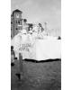 Old wooden sidewalk, St. Eugene Hospital in back ground. Unknown woman in foreground.