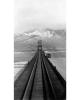 Shows train crossing trestle.photograph : b&w