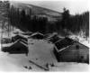 Logging Camp Bull River, camp buildings in back ground. Horse team and workers in foreground. |