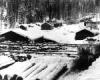 Logging Camp Bull River, camp buildings with stacked logs in back ground |