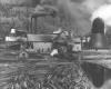 Logs on river at Bull River Mill location. Mill in the background. Bull River area |