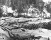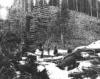 Logs stacked in forest, winters work. Loggers are seen posing on several levels of the stacked logs. Yahk or Bull River area |