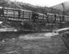 Log run on mountain en route to river in the Bull River area, logs floating down chutes to river. Worker can be seen ready to break up any jam along the way. |