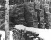 Stacked rail road ties, at mill, a winters work. Workers can be seen standing on top of the stacked ties..