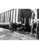 Train Wreck, Fording River date unknown, shows work crew with car off tracks. |