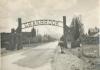 Entrance to the City of Cranbrook, BC, via the original stone arches that spanned the road. Heading into town, is a person riding a horse, while an older style vehicle is coming down the road. Central School can be seen over to the left. |