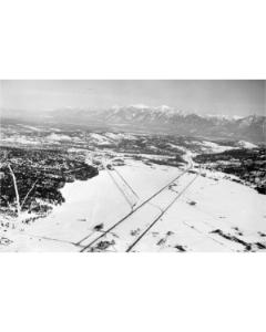 Accession: 1976.031.011 Object: photograph : b&w Title: Cranbrook Airport Runway, Cranbrook, BC Showing 'Kockias' Description: Aerial photo of Cranbrook Airport Runway showing "Kockias"