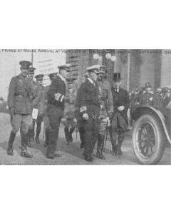 Accession: 1980.068.009 Object: photograph : b&w, mounted Title: H.R.H. Prince of Wales Arrival at Vancouver, B. C. Description: Postcard written Mar. 24, 1921. Addressed to Mrs. Thomas Miller by her mother. Also shares with 1980.068.008 and 1980.068.028 of Cranbrook swimming pool Item Date: Sept. 1919 Size: 9 x 14 cm Photographer: Frank, Leonard, Vancouver, BC Location: 1-2-3-110 Indexed In: Government » Officials » British Royalty