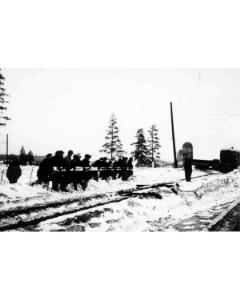 Accession: 1980.081.028 Object: photograph : b&w Title: CPR Yard, Cranbrook, BC Description: Sectionmen changing rail in east end Cranbrook Yard, manually lifting rail section in snow.