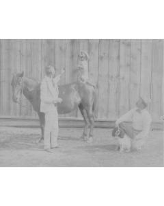 Accession: 1985.011.011 Object: photograph : b&w Title: Cranbrook, B.C. Description: V Hyde Baker, horse, dogs, Mr Laidlaw