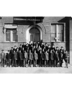 Accession: 1989.064.002 Object: photograph : b&w Title: Cranbrook, B.C. Description: Cranbrook's 3rd contingent on steps of City Hall