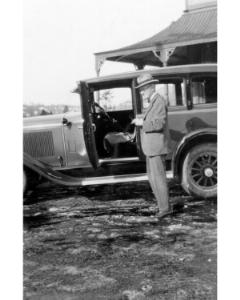 Accession: 1990.091.035 Object: Photograph : b&w Title: Olive Chivers Collection Description: Mayor Tommy Roberts standing next to an earlier style vehicle
