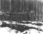 Accession: 2002.098.016 Object: Photograph : b&w Title: Local Logging History Description: Stacked rail road ties, at mill, a winters work. Workers can be seen standing on top of the stacked ties..