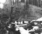 Accession: 2002.098.017 Object: Photograph : b&w Title: Local Logging History Description: Stacked rail road ties,at mill, a winters work. Workers can be seen standing at base of the stacked ties. Camp dog also in photo.