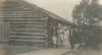 Accession: 2003.037.001.017 Object: Photograph : b&w Title: MacPherson and Bridges Family Photo Albums Description: Two couples, wearing suits and dresses, stand next to a log cabin, two young children are with one of the couples Size: 24 x 40 cm Location: PHOTO.OS.0032.0036 Indexed In: Cranbrook » Personalities » Letter B » Bridges family