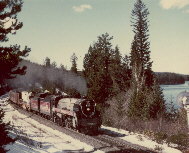 Accession: 2004.006.558 Object: photograph : col Title: John Poulsen Collection Description: BC Rail steam locomotive #2860, hauling passenger cars taken on a remote rail line in the mountains along side a river