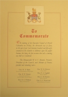 Accession: 2007.001.007 Object: COMMEMORATION Title: Description: of meeting of Exec. Council of BC June 13, 1958 as1st occasion of such held in Cranbrook. Presiding: W.A.C. Bennett, Premier. Attending: W.D Black, R.W. Bonner, R.G. Williston, W.K. Kiernan, P.A. Gaglardi, L.R. Peterson, E.C. Westwood. (Min's. of Govt) Size: 19" x 13.5" Location: Archives Storage Indexed In: Cranbrook » Celebration