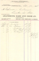 Accession: 2007.071.004 Object: textual record : receipt Title: Cranbrook Sash & Door Co. Monthly Statement for Robinson - McKenzie Lumber Co. Ltd. Description: Printed monthly account statement listing transactions. Originally found in ledger (CBK.2007.071.001) Item Date: Oct. 31, 1908 Size: 21 x 14 cm Pages: 1 Location: 2-1-1-35 Indexed In: Cranbrook » Industry » Cranbrook Sash