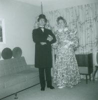 Accession: 2009.003.007 Object: photograph : b&w Title: Bill and Phyllis Benson Description: Bill (son of Oscar Vilhelm Benson) and wife Phyllis Benson. Bill dressed in his dad's wedding tuxedo (CBK.2009.003.001-005) for Sam Steele Days celebration. Item Date: 1965 Size: 9 x 9 cm Location: 1-4-2-6 Indexed In: Cranbrook » Personalities » Letter B » Benson, Bill