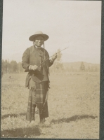Accession: 2009.030.245 Object: photograph : b&w, mounted Title: Native man Description: Native man in traditional clothing Size: 7 x 5 cm Photographer: H.T. Nation Location: PHOTO.OS.0031.0027 Indexed In: Social » Ethnic Groups » First Nations