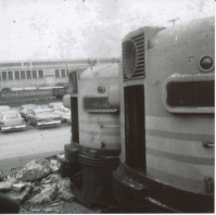 Accession: 2012.002.007 Object: textual record : photo locomotive engine Title: CPR Loco Shells, St Lawrence Iron & Metal, Montreal - 9 B/W Photographs - Front Tip Close-up Description: 9 B/W Photographs - Canadian Pacific Diesels, Front Tip Close-up with notation on back of photo reading "4008 - 4009 Louie's-Mtl, 12/63, Don Young". Item Date: December 1963 Size: 10.25 x 10 cm Photographer: Young, Don Location: 1-5-8-19 Indexed In: Cities » Quebec » Montreal