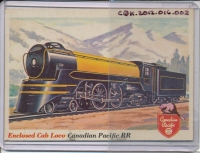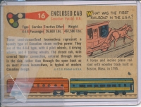 Accession: 2012.016.002 Object: textual record : card Title: Topps 'Rails and Sails' Bubble Gum Cards - Card 16, Enclosed Cab Loco Description: Topps 'Rails and Sails' Bubble Gum Cards - Card 16, Enclosed Cab Loco - These semi-streamlined locomotives represent a speedy type of Canadian steam motive power. They are of the 4-4-4 type, with 4 pilot wheels, 4 driving wheels, and 4 trailing wheels. The closed cab, with covered tender connection, entered through doors in the side, rather than through the open back as on most steam locomotives, is typical of modern Canadian design. Item Date: Unknown Size: 10 x 7.5 cm Author: Will, Grant B Creator: Topps Bubble Gum Cards Location: 2-2-4-21 Indexed In: Railroad » Company » CP Rail