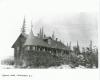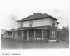 front of Baker Home with ivy growing on corner, round structure with pointed roof, flowers in foreground and trees on left side of house |