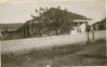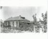 house with shingle roof, lots of trees, plants and vines around house, barbed wire fence |