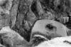 Train Wreck, CPR unit #4054 B&W deoicts cars on track and in lake, and locomotive and boulder on tracks. Taken from top of boulder.