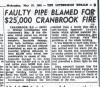 Faulty Pipe Blamed for $25,000 Cranbrook Fire Photocopied newspaper article regarding the fire in the Allan Hotel which completely destroyed the building, and caused considerable damage to the adjoining two-storey garage building. Two fatalities in the fire were identified as Theodore Swanson and George Satich.