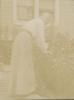 Mrs. Piggott bending over picking flowers from her flower gardenphotograph : b&w, mounted