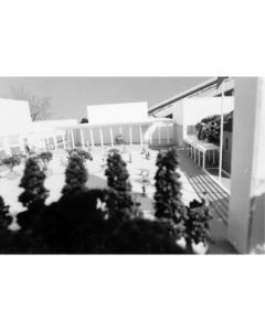 Accession: 1976.012.033 Object: photograph : b&w Title: Central Court, East from 10th Avenue, Cranbrook, BC Description: Photo of Central Court looking east from 10th Avenue from Heritage Square model, Cranbrook, BC Size: 11 X 8 cm Location: 1-1-1-20 Indexed In: Cranbrook » Building » Public » City Hall