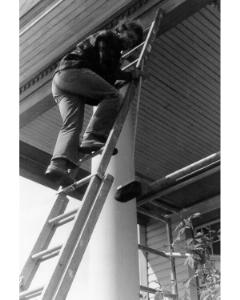 Accession: 1976.036.003 Object: photograph : b&w Title: Phil Foster on Ladder Studio Renovation, Cranbrook, BC Description: Photo of Phil Foster on ladder