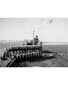 Accession: 1976.049.103 Object: photograph : b&w Title: Discer in Operation on Prairies Description: Photo of a discer on the Prairies, from MacKinnon Collection Size: 6 x 5 cm Location: 1-1-5-102 Indexed In: Industry » Machinery & Equipment