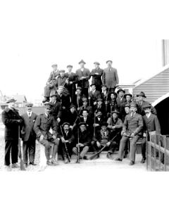 Accession: 1976.063.004 Object: photograph : b&w Title: WWI Recruits on Steps of Courthouse, Cranbrook, BC Description: Photo of WWI recruits on steps of Courthouse, Cranbrook, BC