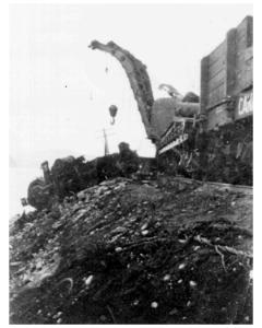 Accession: 1977.019.013 Object: photograph : b&w Title: Moyie Lake Wreck, Crane Lifting Debris off Shore Description: Photo of Moyie Lake Wreck, with crane lifting debris off shore