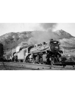Accession: 1977.042.001 Object: photograph : b&w Title: CPR Locomotives #5108 & #3757 (KVR) at Frank Slide, AB Description: Photo of Locomotives #5018 & #3757 of the Kettle Valley Railway at Frank Slide, AB