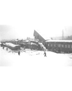 Accession: 1979.083.002 Object: photograph : b&w Title: CPR Wreck at Fassiferne Description: see 1979.083.001 - .005 Item Date: 1950 Size: 7 x 12 cm Location: 1-2-2-86 Indexed In: Railroad » Accident » Fassifern