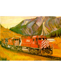Accession: 1980.001.003 Object: photograph : col. Title: Westbound Freight Entering Corridor into Rockies Description: Reproduction (colour plate) of a painting by R F M McInnis Size: 22 x 29 cm Creator: McInnis, R. F. M. Location: 1-2-2-118 Indexed In: Cranbrook » Personalities » Letter H » Hungry Wolf, Adolf