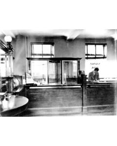 Accession: 1980.009.002 Object: photograph : b&w Title: Interior Royal Bank building Description: Item Date: 195-? Size: 9 x 11 cm Location: 1-2-3-2 Indexed In: Cranbrook » Building » Bank » Commerce