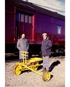 Accession: 1980.020.001 Object: photograph : col Title: G Doeksen & G Anderson with Velocipede Description: In front of Baggage Car at CRM Item Date: 1979 Size: 18 x 13 cm Location: 1-2-3-29 Indexed In: Cranbrook » Personalities » Letter A » Anderson, Garry W