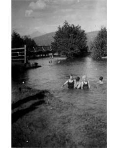 Accession: 1980.068.007 Object: photograph : b&w, mounted Title: Old Swimming Hole on Joseph's Creek, Cranbrook, BC Description: people swimming and on bank Size: 8 x 7 cm Location: 1-2-3-109 Indexed In: Cranbrook » Personalities » Letter D » Duncan, Helen