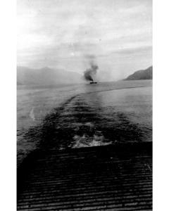 Accession: 1980.068.012 Object: photograph : b&w, mounted Title: Kootenay Lake from Steamboat Nasookin, over the Paddle Wheels Description: CPR steamboat Mounted on blue and orange construction paper. Size: 12 x 7 cm Location: 1-2-3-113 Indexed In: Cranbrook » Personalities » Letter D » Duncan, Helen