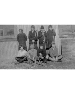 Accession: 1980.068.017 Object: photograph : b&w, mounted Title: Cranbrook Girls' Hockey Team Description: Nell Miller, Hazel Campbell, Marg Willis, Kate Martin, Helen Campbell, Elizabeth Miller, Kathleen Dazall.