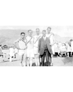 Accession: 1980.068.020 Object: photograph : b&w, mounted Title: Cranbrook Boys Track Team at Trail Meet Description: Shorty Clark, Stan Moffatt, Fred Large, Mr. Martin, Bill Taylor