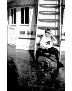 Accession: 1980.068.022 Object: photograph : b&w, mounted Title: Kate Martin Aboard the Nasookin Description: Mounted on blue and orange construction paper. Item Date: 1926 Size: 9 x 6 cm Location: 1-2-4-2 Indexed In: Cranbrook » Personalities » Letter M » Martin, Kate