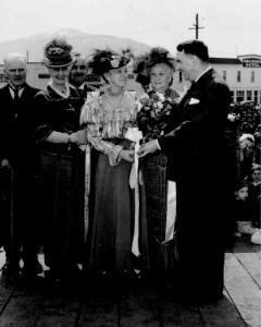 Accession: 1980.071.005 Object: photograph : b&w Title: Cranbrook Personalities Description: (l to r) Alderman James Dunlap (Jubliee Chairman), Mrs F W Green, Mayor R E Sang, Mrs T S Gill, Mrs Archie Blair, G H Bailey