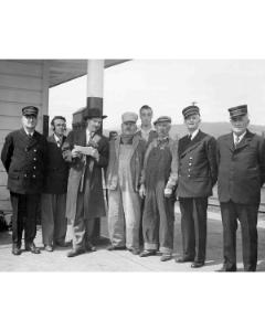 Accession: 1980.071.006 Object: photograph : b&w Title: Canada Network Broadcast Description: (l to r) A J (Fred) Genest, Tommy Walsh, Announcer Bill Bracken, Hugh Brock, Pilot Don Hermon, Tommy Wardman, Girvin Moore, Dan Burton