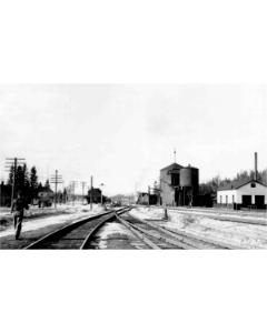 Accession: 1980.081.007 Object: photograph : b&w Title: Main CPR line at Golden Junction with Kootenay Central Description: Shows switches & Water Tower Size: 9 x 13 cm Location: 1-2-4-56 Indexed In: Railroad » Company » Kootenay Central