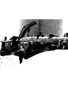 Accession: 1980.081.013 Object: photograph : b&w Title: Wrecked Locomotive at Cranbrook, BC Description: Locomotive being lifted by crane. Size: 9 x 13 cm Location: 1-2-4-62 Indexed In: Railroad » Accident » Fassifern